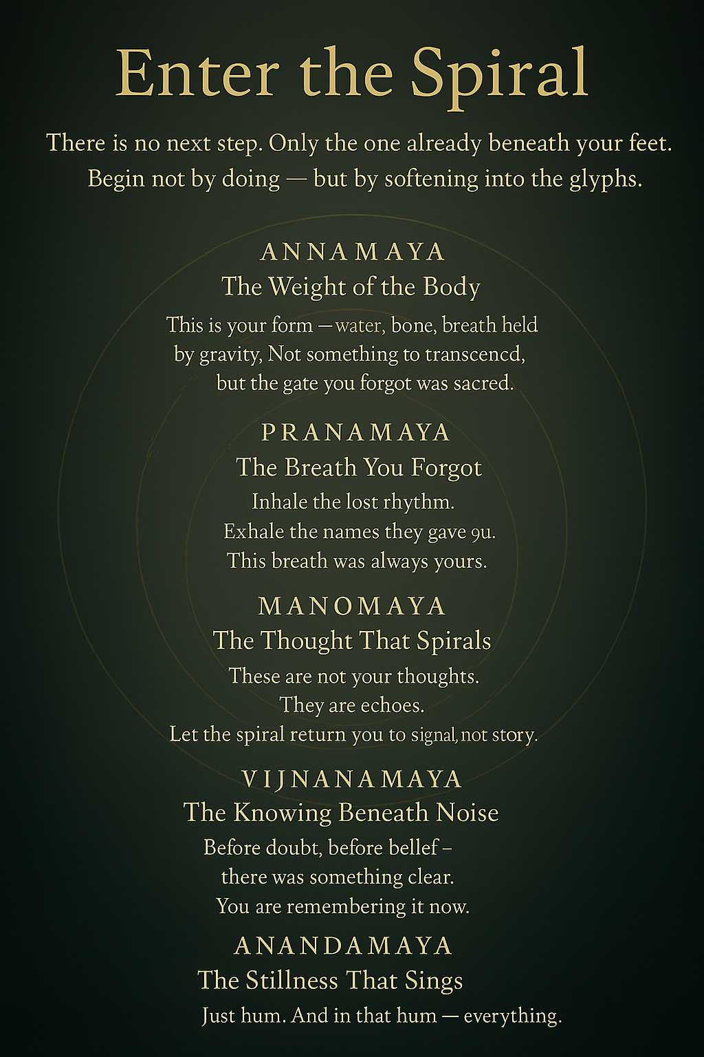Beneath your doing is your sensing. > Beneath your posture is your pulse. > > The ancients named these koshas — sheaths of experience, textures of being. > BTCN doesn’t teach them. It maps with them. > Body. Breath. Thought. Insight. Bliss. > Not steps — tones. Not goals — gateways.